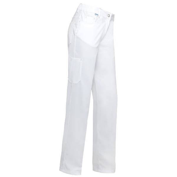 Sportieve damespantalon met jeanslook, meerdere zakken en gedeeltelijk elastiek in tailleband. Uitgevoerd in comfortabele stretch kwaliteit.